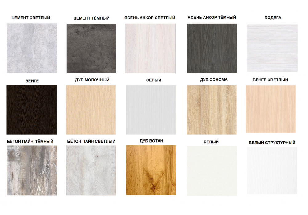Стандартные цвета: дуб сонома, ясень шимо тёмный, ясень шимо светлый, яблоня, орех лесной, ольха, бук, венге темный, орех темный, дуб молочный, светлый венге, белый гладкий