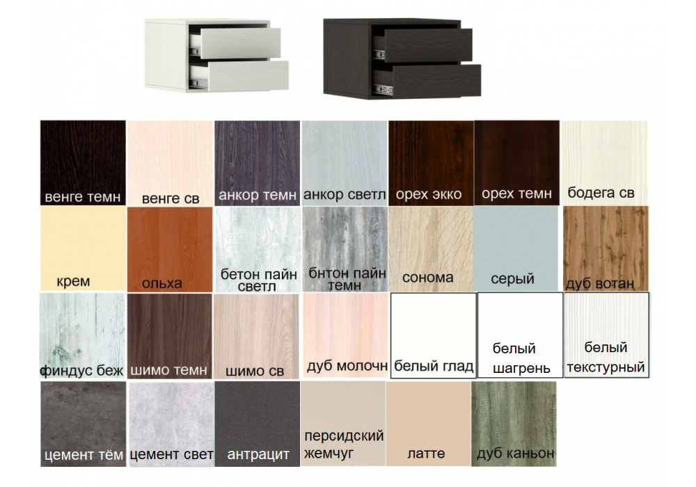 Стандартные цвета: белый , дуб сонома, ясень шимо тёмный, ясень шимо светлый, яблоня, орех лесной, ольха, бук, вишня, венге темный, орех темный,дуб молочный, светлый венге.