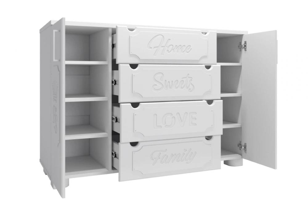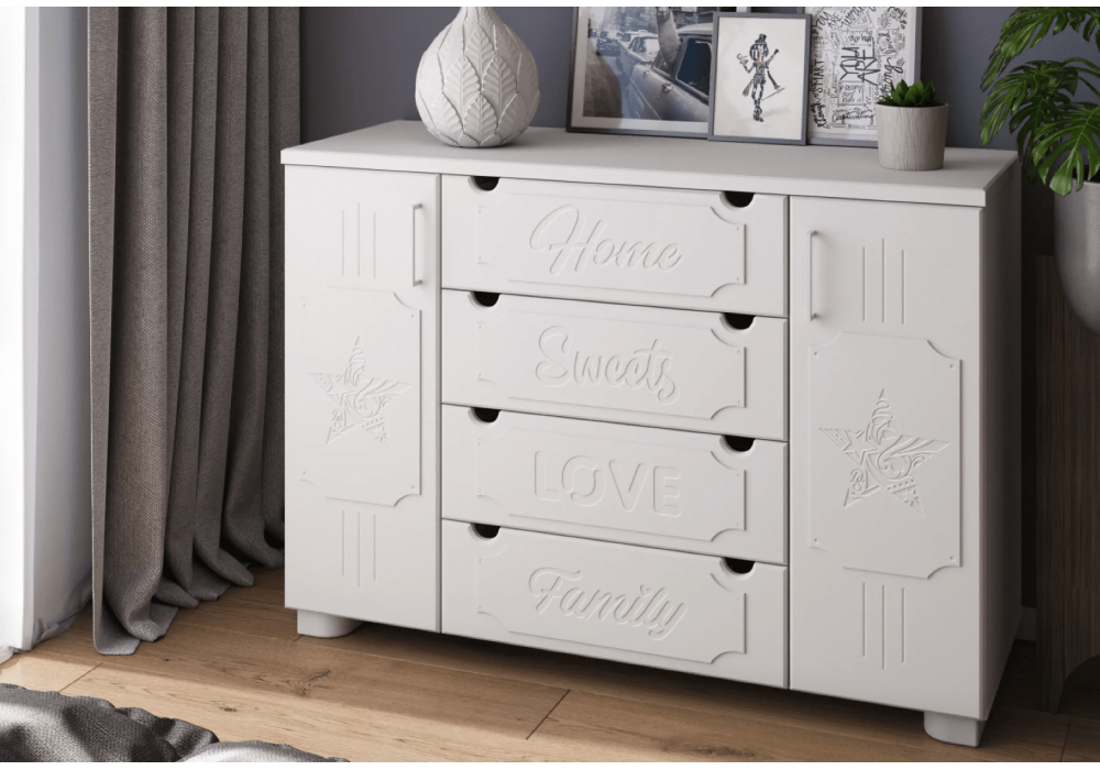 Система мебели "Дримстар" включает в себя отдельные самостоятельные модули, сочетающие в себе функциональность и уникальность дизайна. С базовым набором модулей легко оформить интерьер любого помещения. Все модули можно комбинировать между собой. Фасады украшены надписями, которые придают моделям оригинальный вид. Коллекция "Дримстар" поможет вам в оформлении стильного и современного интерьера. Столешница изготовлена из МДФ толщиной 25 мм. В ящиках используются телескопические направляющие полного выдвижения. Фурнитура: петли с доводчиками.